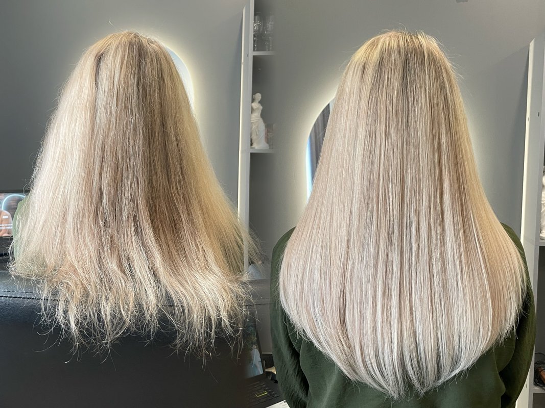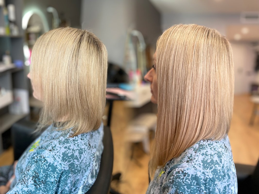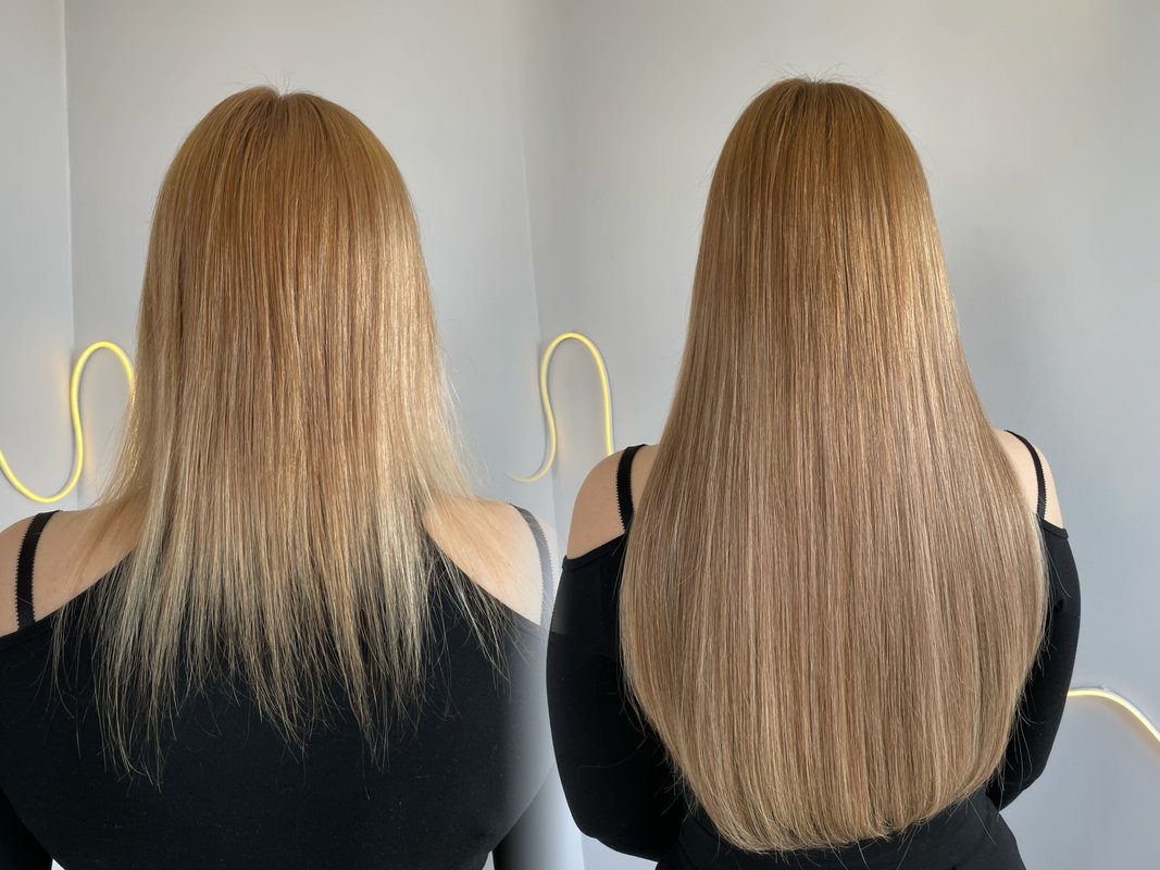 Хорошо выполнена работа, приятная атмосфера, есть крутые мастера. Их профессионализм проявился в том, как была выполнена работа. Мы делали коррекцию наращенных волос: за время носки волосы немного отросли, намешали цвет прямо на месте, чтобы получилось здорово и цвет стал более похожим на мой. Обычно я делаю коррекцию каждые 3 месяца, но в данный раз сделала позже из-за болезни и госпитализации.
